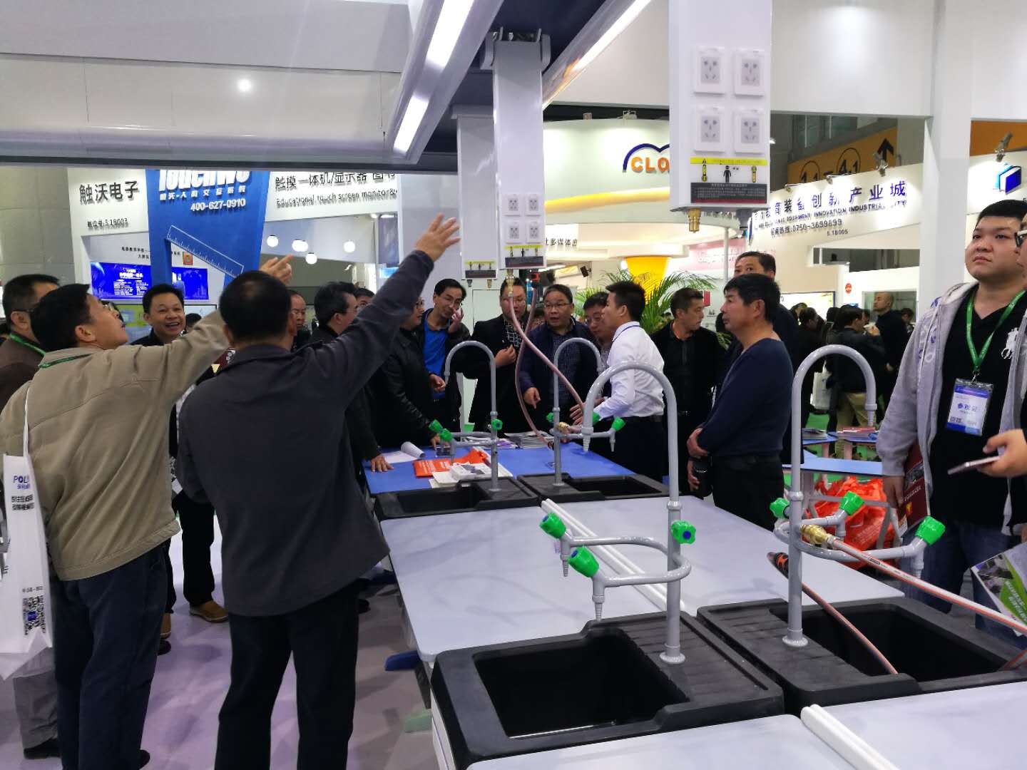 新科展位頂裝式可升降集成系統—智慧創新學科實驗室吸引了大批客戶前來參觀、咨詢和拍照。營銷人員正在精彩的講解。