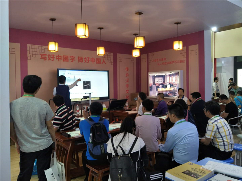 工作人員在向參觀客戶(hù)講解數(shù)字書(shū)法教室的授課知識(shí)