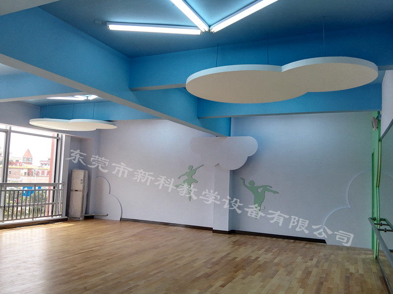 學校舞蹈室采用天藍色的天花,藝術墻紙為裝修風格,優美的空間環境給師生帶來輕松愉悅的心情,在翩翩起舞的同時還收獲一份美好的心情,通過舞蹈社團課使學生學會有關舞蹈的技能在實踐活動中不斷的提煉情感,增強技藝提高對藝術作品的理解力,表現力、想象力和創作力,努力為校園文化增添光彩,并力創建學校特色添磚加瓦。