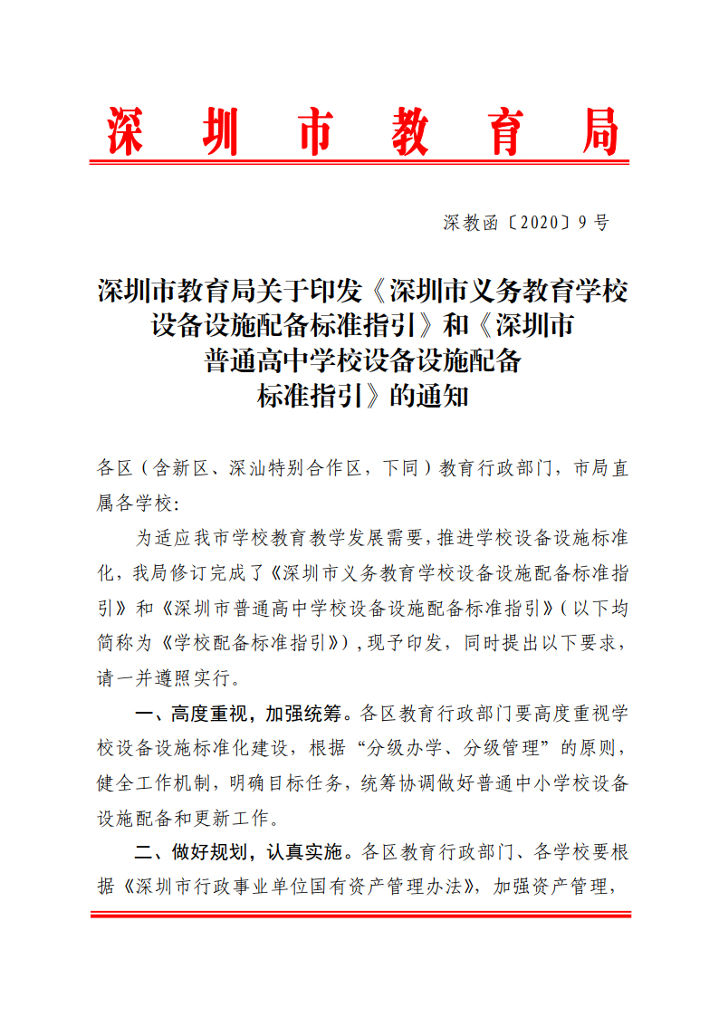 深圳市教育局關于印發《深圳市義務教育學校設備設施配備標準指引》和深圳市普通高中學校設備設施配備標準指引》的通知